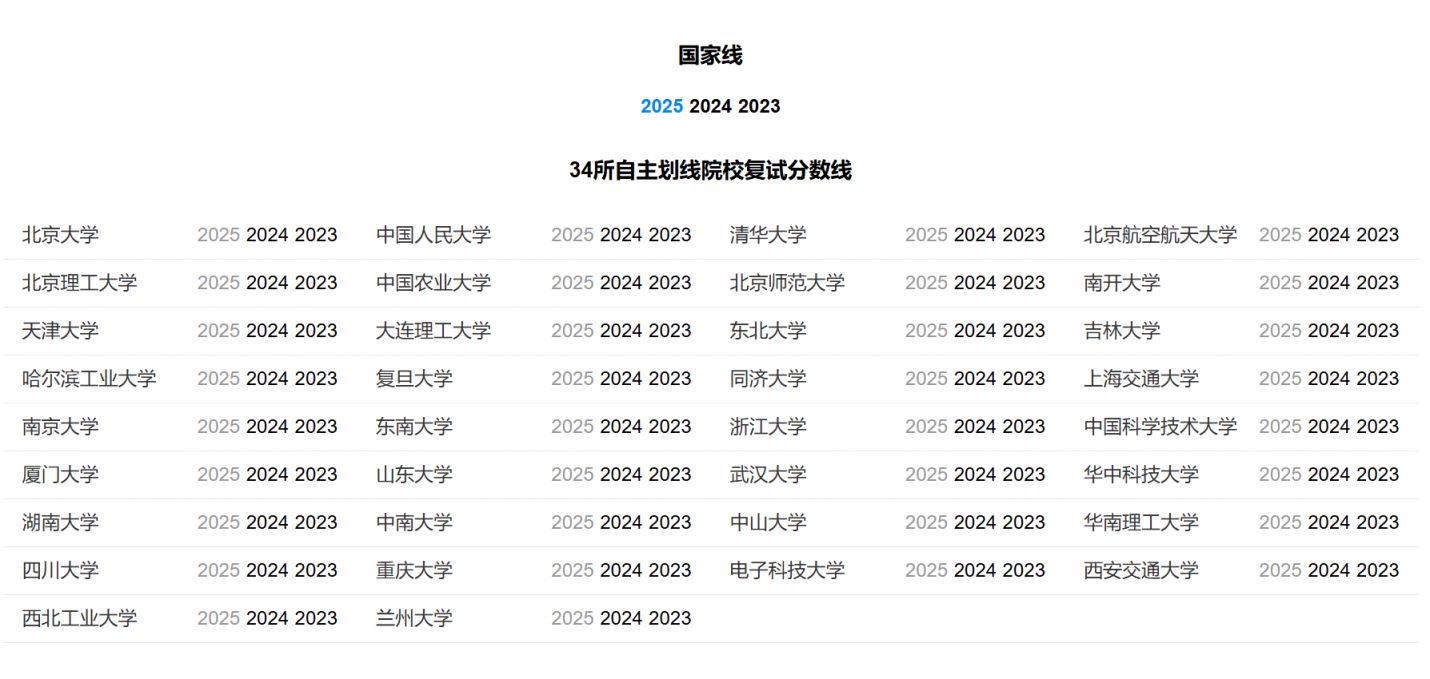 进入研招网的当年研考分数查询·复试分数线汇总主题页面,往下滑,就能看到34所自主划线院校复试分数线查询入口,目前都是灰色的没有开放