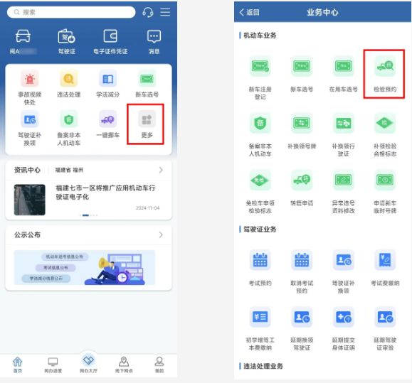 操作步骤:“交管12123”APP → 业务中心 → 机动车业务 → 检验预约 → 填写相关信息在线预约办事地点、时间。