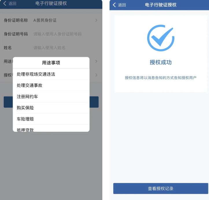 电子行驶证 → 授权 → 新增授权 → 填写被授权人身份证号、姓名和授权有效期,选择用途事项 → 提交授权 → 授权成功 → 用户进入“电子行驶证授权”页面可出示授权的电子行驶证。